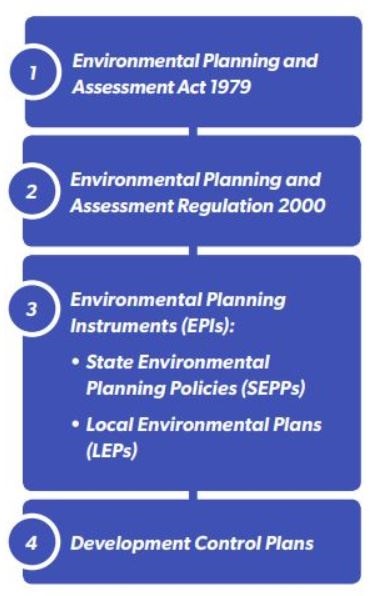 The planning system has a hierarchical structure with the Environmental Planning and Assessment Act 1979 sitting at the top of the hierarchy, as shown below.